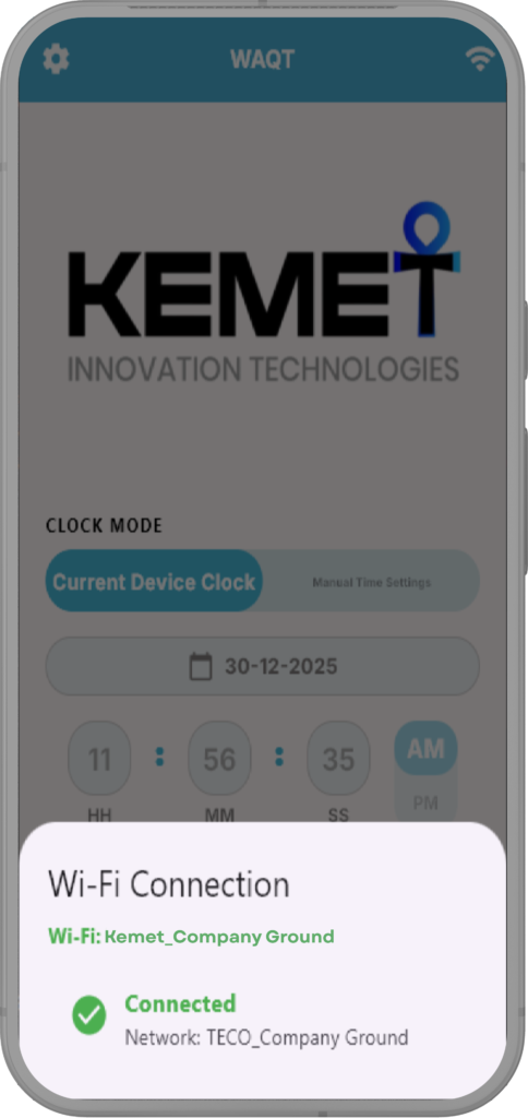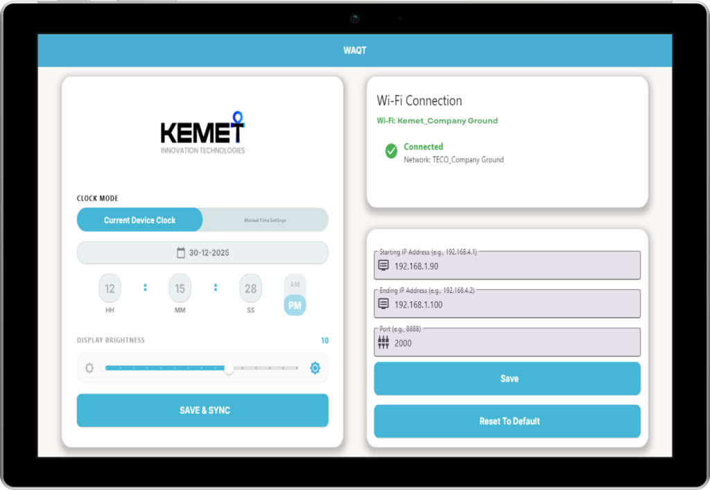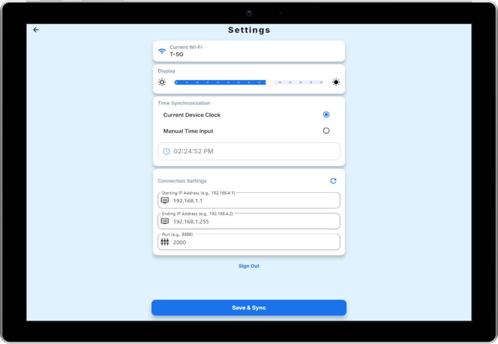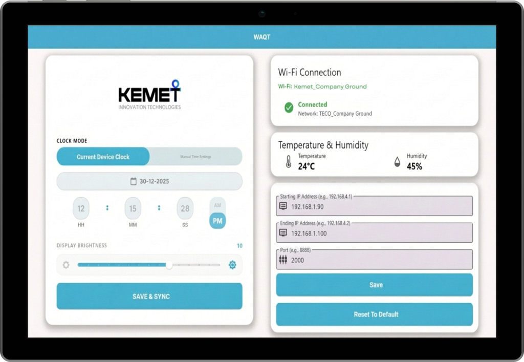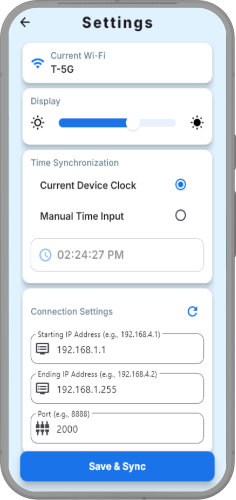 It supports automatic and manual time control, allows settings to be sent to one clock, and includes brightness adjustment. Wi-Fi status is displayed clearly, and all configurations are stored locally for reuse and updates.