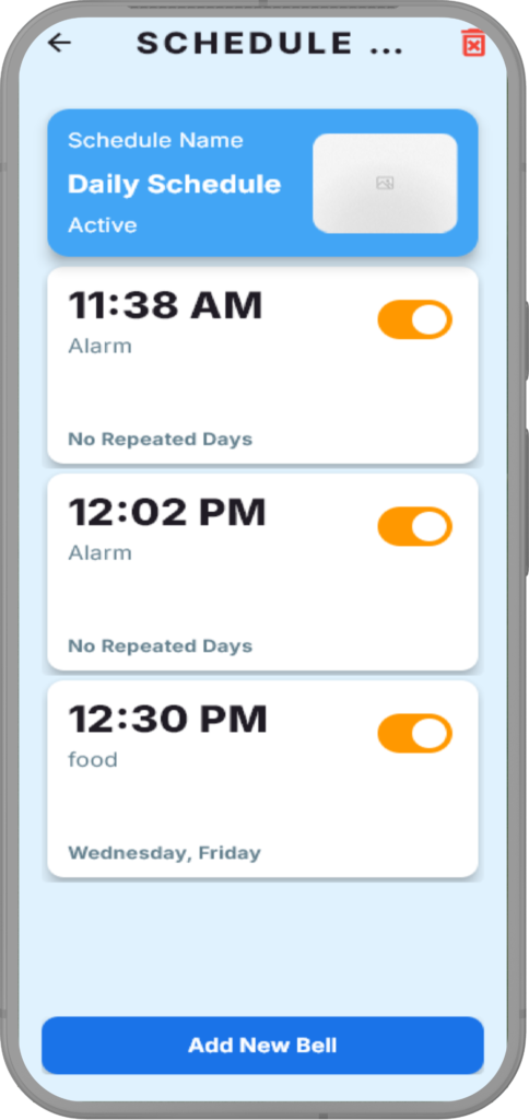 Each bell can be customized with a specific time, predefined bell sound, repeat options, and selected days of the week. The system supports both one-time bells and repeated bells.