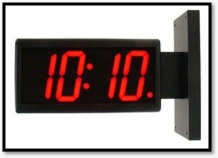 The clock features a single-sided display with flicker-free operation. It displays hours and minutes, offers high brightness, and provides a wide viewing angle. Maximum power consumption is 10 W.